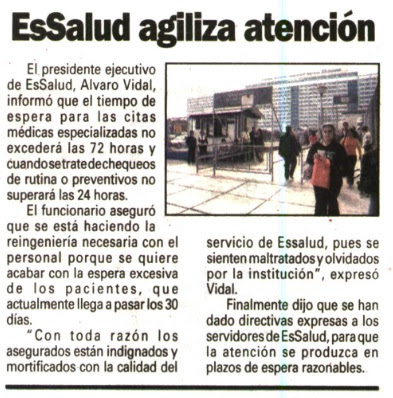 ESSALUD BUSCA REDUCIR TIEMPO DE ESPERA. El tiempo de espera para las citas médicas especializadas en el Seguro Social de Salud (Essalud) no será mayor a 72 horas, pero cuando se trate de chequeos de rutina o preventivos no superará las 24 horas, adelantó el presidente ejecutivo de esa institución, Álvaro Vidal, al indicar que se trabaja en pos de lograr ese objetivo. En diálogo con la agencia Andina, el funcionario aseguró que se ejecuta la reingeniería necesaria con el personal, porque se busca acabar con la espera excesiva de los pacientes, que llega a ser superior a los 30 días.