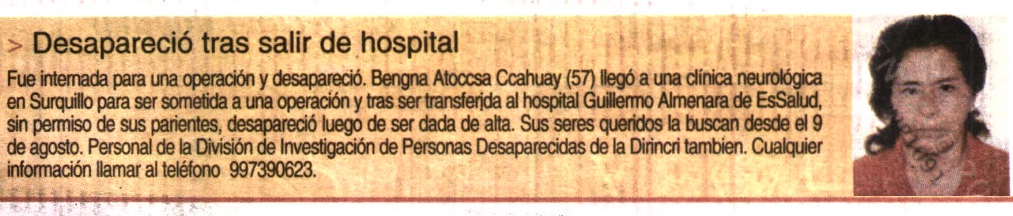 DESAPARECIÓ TRAS SALIR DE HOSPITAL. Fue internada para una operación y desapareció. Bengna Atoccsa Ccahuay (57) llegó a una clínica neurológica en Surquillo para ser sometida a una operación y tras ser transferida al hospital Guillermo Almenara de EsSalud, sin permiso de sus parientes, desapareció luego de ser dada de alta. Sus seres queridos la buscan desde el 9 de agosto. Personal de la División de Investigación de Personas Desaparecidas de la Dirincri también. Cualquier información llamar al teléfono 997390623.